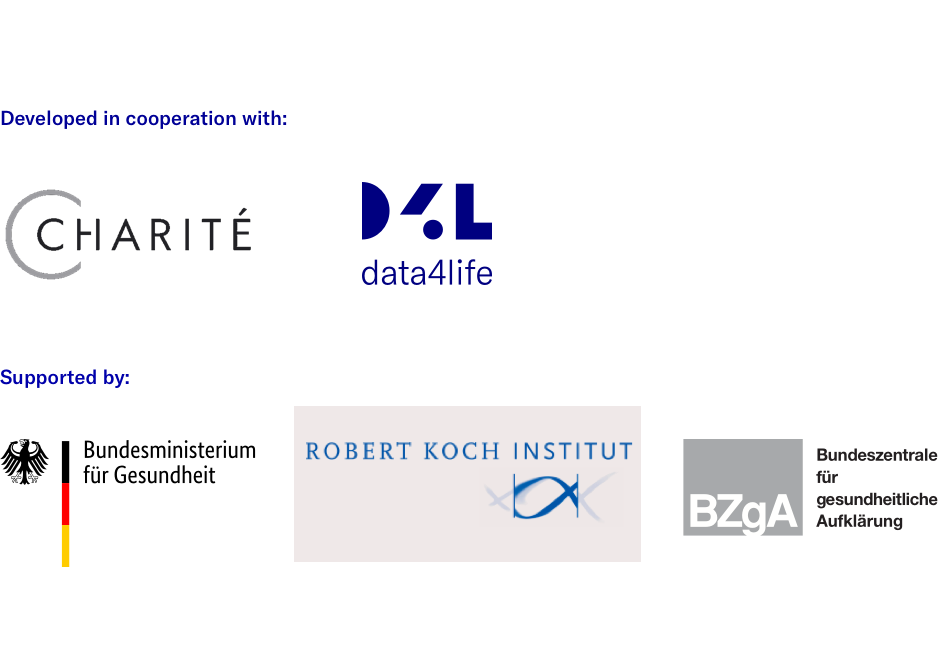 In order to provide people with guidance to better assess their symptoms and derive necessary actions, at the beginning of the COVID-19 pandemic in spring 2020, Charité - Universitätsmedizin Berlin developed the CovApp in collaboration with Data4Life. The joint initiative was supported by the Robert Koch Institute (RKI), the German Federal Ministry of Health (BMG) and the German Federal Center for Health Education (BZgA). Data4Life was significantly involved in the project until June 2021.